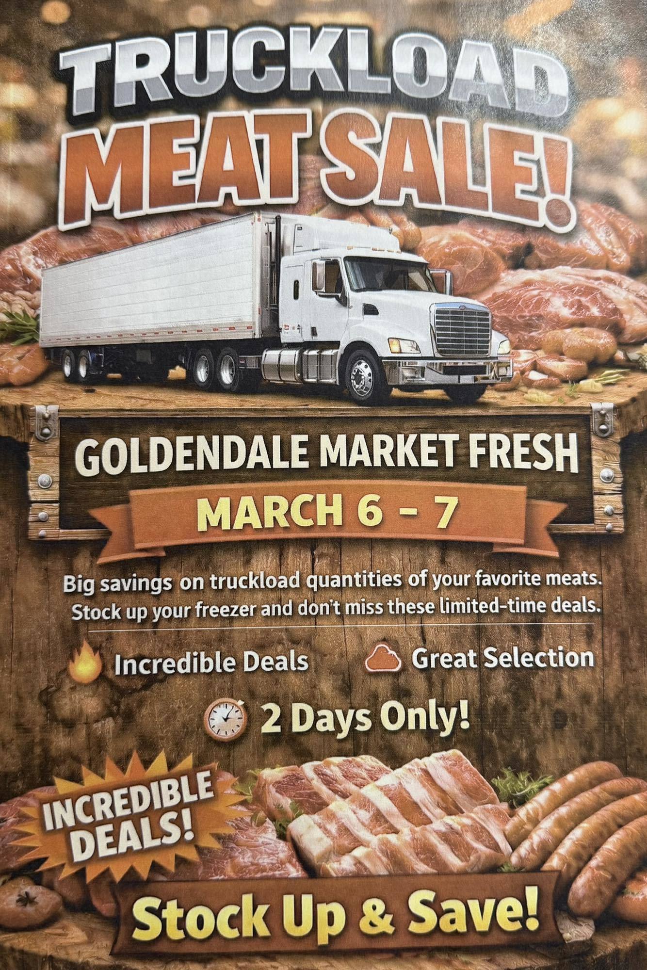 Truckload Meat Sale Back to Hot Deals Truckload Meat Sale By Goldendale Market Fresh 1/21/2026 Images × Share × Email Facebook LinkedIn X Pinterest Powered By GrowthZone